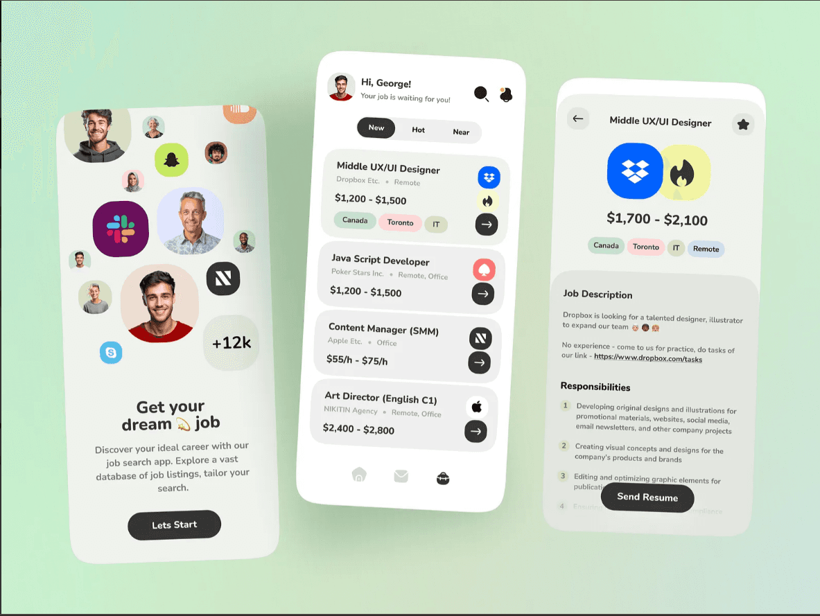 Color & Theme: Discussing the application of distinct themes—the vibrant, high-contrast look for the Talent Platform, the warm, minimalist tones for the Food Ordering App, the clean white space for the Job Search App, and the focused dark mode for the Health Widgets.